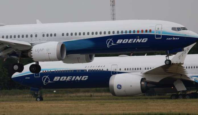 2023年6月19日,在法国巴黎近郊的布尔歇机场举行的巴黎航展上,波音737 MAX和波音777X飞机(下)进行表演 。新华社记者高静摄