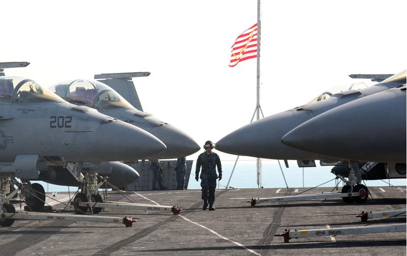 2011年1月11日,在韩国釜山停泊的“卡尔·文森”号航母上,一名士兵从战斗机前走过。新华社发(朴真熙摄)