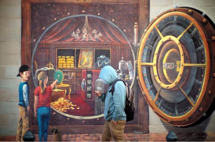 2021年2月18日,在美国加利福尼亚州北部小城圣马特奥,一名边走边看手机的行人从一家店铺外墙上绘制的“宝库”壁画前经过。新华社记者吴晓凌摄