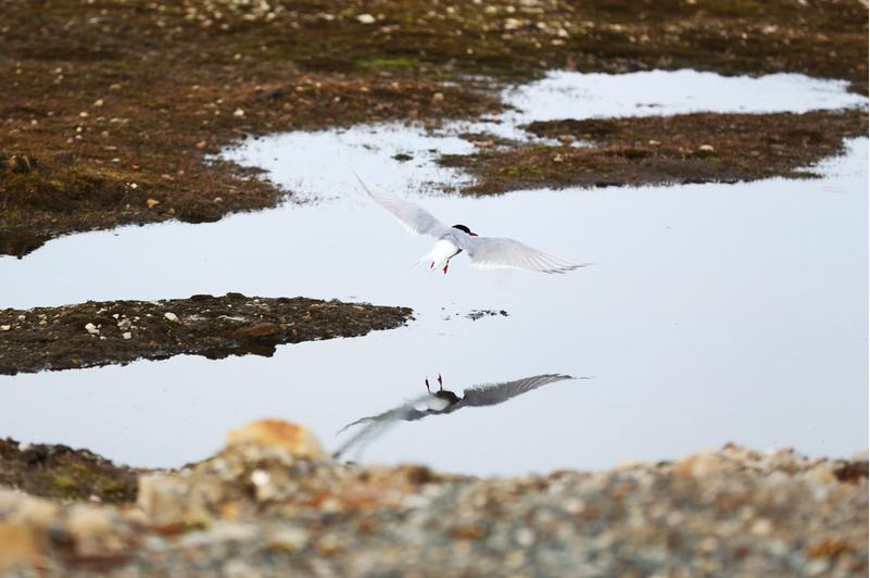 2024年6月20日,在挪威新奥勒松,一只北极燕鸥从水面上飞过。位于挪威斯瓦尔巴群岛的小镇新奥勒松,地处北纬79度,是最靠近北极的人类定居点之一。新华社记者赵丁喆摄