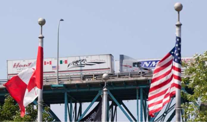 2017年8月16日,在加拿大安大略省温莎市,一辆印有墨西哥、加拿大与美国国旗的长途货车(左)通过大使桥开往美国。新华社发(邹峥摄)