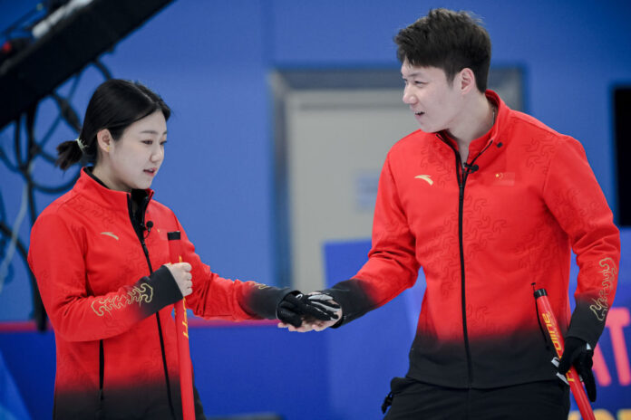2月4日,中国队选手韩雨(左)与队友王智宇在比赛中交流。新华社记者 江汉 摄