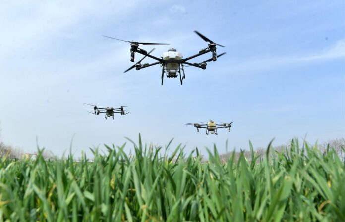 3月13日,在河南省夏邑县圣源果蔬种植专业合作社郭店镇杨吕庙村优质小麦种植基地,无人机在执行植保作业。新华社发(苗育才 摄) 中国人民银行13日召开的会议提出,将进一步疏通货币政策传导渠道,完善利率形成和传导机制,推动社会综合融资成本下降。研究创设新的结构性货币政策工具,重点支持科技创新领域的投融资、促进消费和稳定外贸。